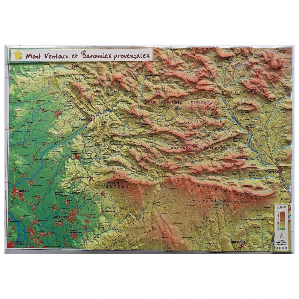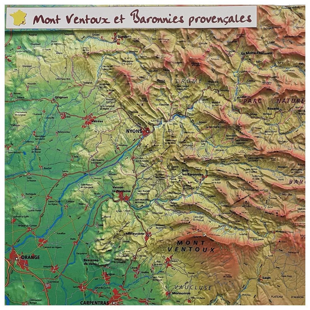 La carte en relief Le Mont Ventoux et les Baronnies Provençales de Geo Relief vous permet de découvrir la région dans les moindres détails notamment de ses massifs. Vous pourrez admirer les principaux points remarquables et sommets dont le fameux Mont Ventoux. L’ensemble des communes est également visible ainsi que les rivières comme la Sorgue, et le réseau routier. Vous pourrez aussi vous rendre compte de ce à quoi ressemble le Parc naturel régional des Baronnies Provençales en termes de topologie. Une carte indispensable pour tous ceux qui souhaitent connaître cette magnifique région ou tout simplement approfondir leurs connaissances.