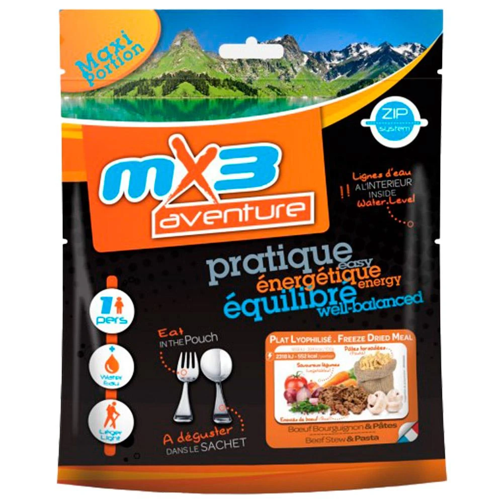 Le plat lyophilisé Bœuf Bourguignon & Pâtes correspond à la recette traditionnelle, savant mélange de bœuf fondant, de pâtes, de carottes et de champignons. La marque MX3 réussit à en faire un vrai régal. Une fois que l’eau que vous avez fait chauffer bout, il suffit de la verser dans le sachet, de mélanger et d’attendre 10 à 15 min avant de déguster. Ce repas, en plus d’être délicieux, est source d’énergie pour répondre à vos besoins nutritionnels quotidiens, quelle que soit l’activité outdoor pratiquée.
