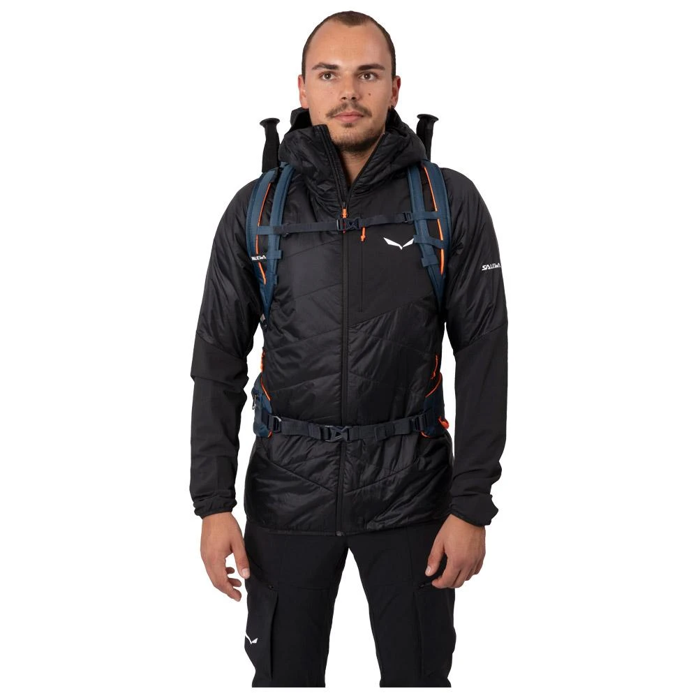 28 litres de volume, de nombreuses poches, confortable, le sac à dos Mountain Trainer II 28 de Salewa propose des caractéristiques idéales pour vos randonnées et via ferrata. Conçu dans une matière en nylon recyclé, celle-ci est très robuste pour vous suivre partout. Son dos respirant Dry Back Contact vous assure un port près du corps assurant ainsi de la stabilité tout en limitant la transpiration grâce à des canaux d’aération 3D. Les bretelles fendues vont aussi la limiter et également garantir une bonne liberté de mouvement. Le sac à dos dispose d’un double système de compression et d’une ceinture enveloppante qui vont permettre d’avoir une charge mieux répartie. Une boucle est également présente sur la ceinture afin d’y attacher des mousquetons. De nombreuses poches sont présentes ainsi qu’une Daisy Chain, un porte-piolet/bâtons ou encore une housse de pluie pratique en cas d’averse.